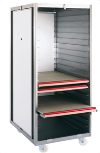 Каркас из нержавеющей стали 2 панели из нержавеющей стали и 2 съемные ламинированные двери из ДСП Кол-во уровней -20 Расстояние между уровнями 81 мм Диаметр колес 100 мм, нейлон Размеры: 4600 - 680х855х1850 мм