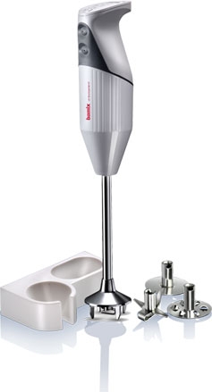 В комплект входят: -Настенный держатель -Многофункциональная насадка -Насадка для перемешивания -Насадка для взбивания Технические характеристики: -Мощный мотор переменного тока 150-200 Вт -Двойная изоляция -Два выключателя с мягкой окантовкой -2 режима скорости: 1- 10000 до 12000 об./мин. 2- 15000 до 17000. Все детали сделаны из высококачественных, не имеющих запаха и не придающих привкуса материалов и являются безопасными при приготовлении пищи.