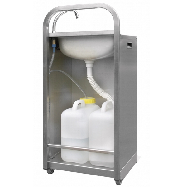 Конструкция из нержавеющей стали 2 контейнера ( под чистую и использованную воду) Водяной насос находится внизу 2 колеса Ø 60 мм. Размер 460х380х850 мм Вес 18 кг.