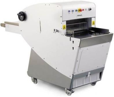 Автоматическая промышленная хлеборезка. Загрузка с задней стороны. Имеются нижняя и верхняя конвейерные ленты для транспортировки хлеба, а также электрорегулировка высоты ленты, регулировка скорости ленты, регулировка ограничителей для хлеба (максимальная длина буханки 520 мм). Рассчитана на высоту буханки 45-165 мм. Набор для смазки лезвий с электронно регулируемой помпой (для ржаного хлеба).